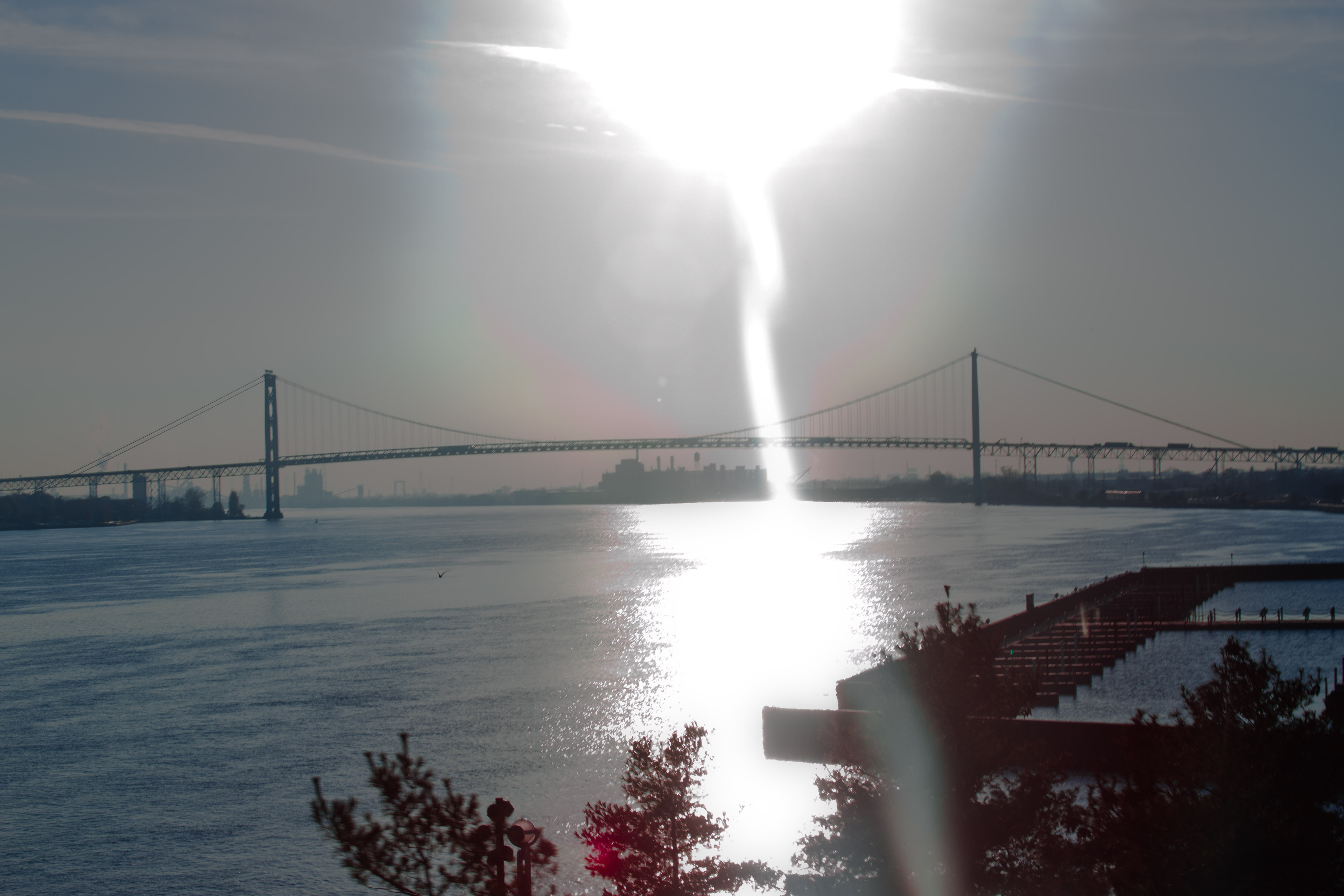 sun reaching into the detroit river